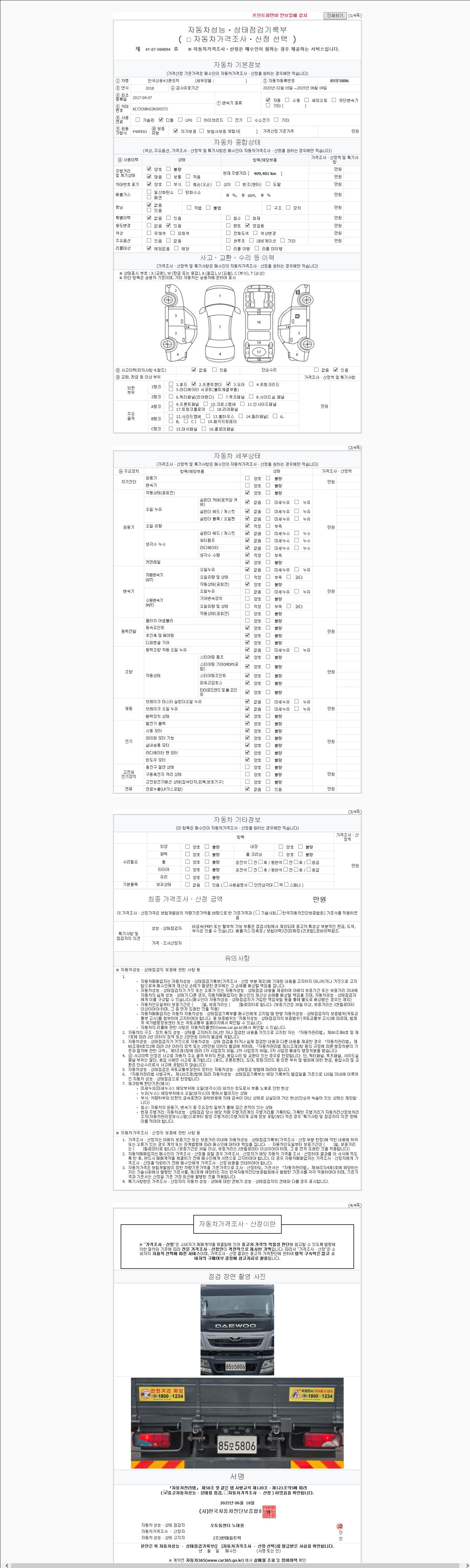 | 주행거리 | 409,401 km | 차량번호 | 85모5806 |