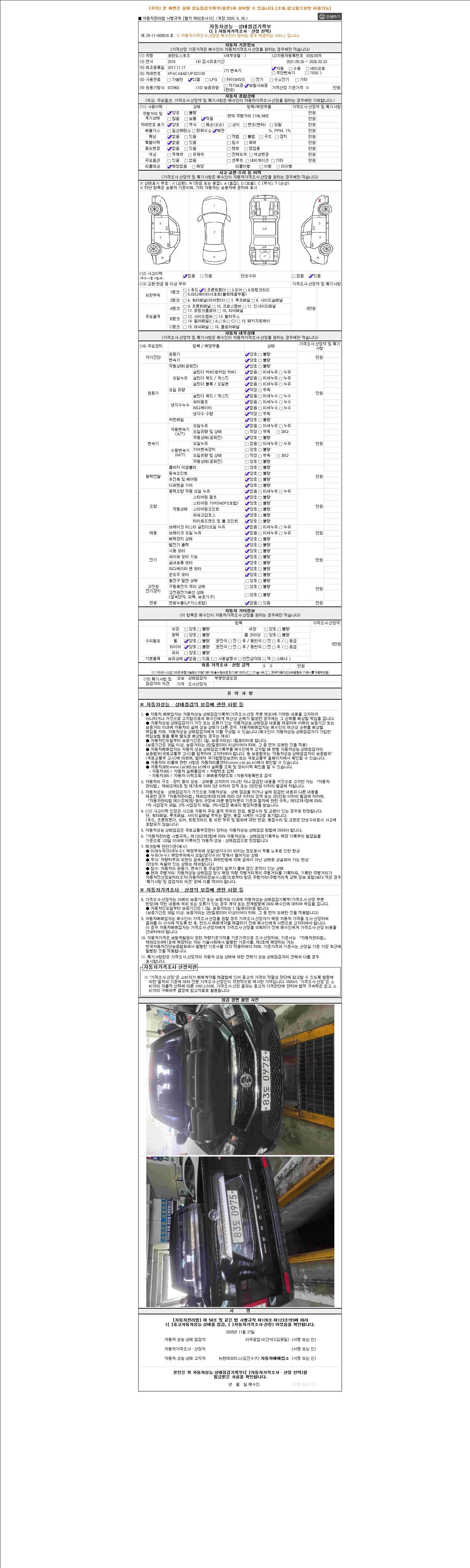 자동차관리법 시행규칙 제120조의 규정에 따라 별지 제 82호서식 《중고자동차 성능, 상태점검 기록부》를 발행한 성능, 상태점검자 및 매매자는 아래의 보증기간 또는 보증거리 이내의 중고자동차, 성능점검 기록부에 기재된 내용과 자동차의 실제 성능, 상태가 다른 경우 계약 또는 관계법령에 따라 매수인에 대하여 책임을 집니다.