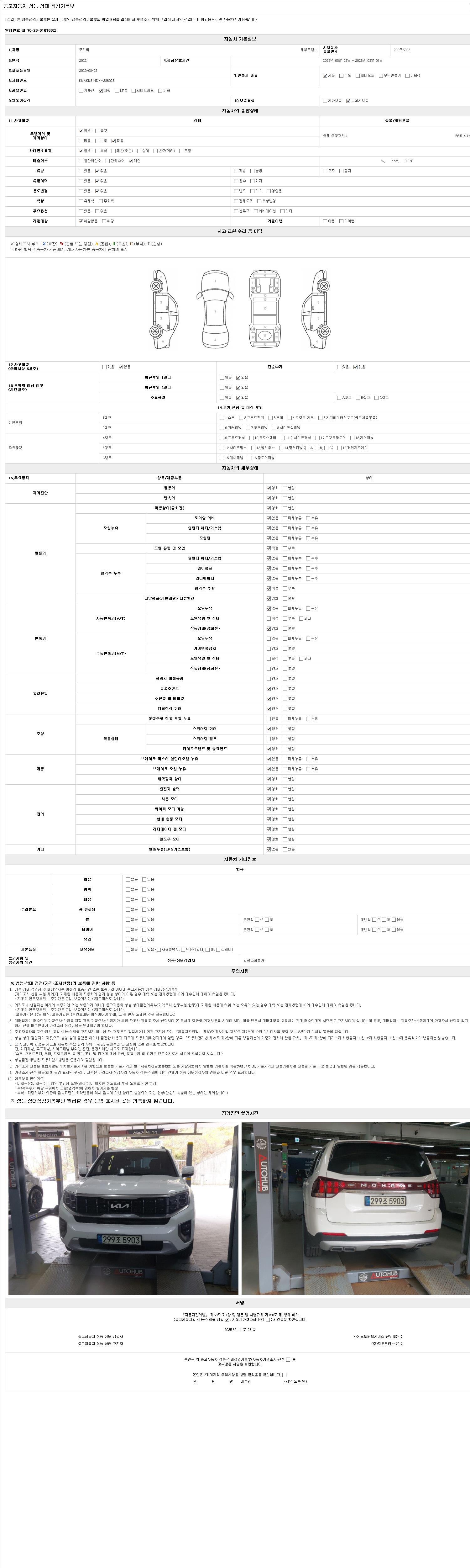 자동차관리법 시행규칙 제120조의 규정에 따라 별지 제 82호서식 《중고자동차 성능, 상태점검 기록부》를 발행한 성능, 상태점검자 및 매매자는 아래의 보증기간 또는 보증거리 이내의 중고자동차, 성능점검 기록부에 기재된 내용과 자동차의 실제 성능, 상태가 다른 경우 계약 또는 관계법령에 따라 매수인에 대하여 책임을 집니다.